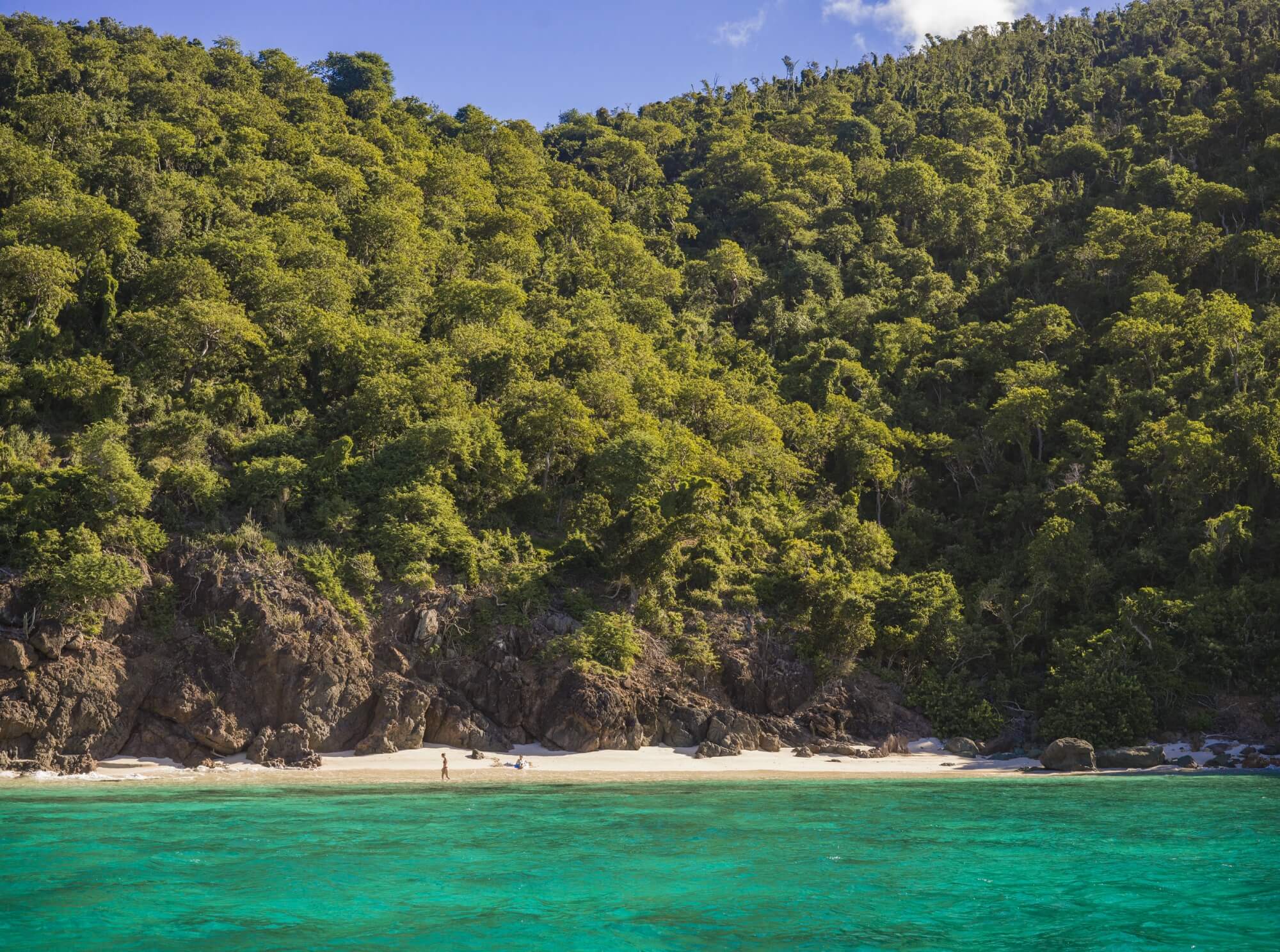 Guests picnic on a perfectly private white sand beach accessed only by boat.